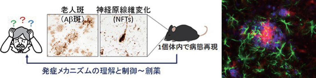 (左図)動物モデル内で、ヒトの病理・病態の完全再現を目指すことで、発症メカニズムの理解と制御に繋がり、そこから創薬標的を見出します。(右図)脳内のβアミロイドの蓄積(青)に対して、ミクログリア(赤)およびアストロサイト(緑)が集簇している病理像。